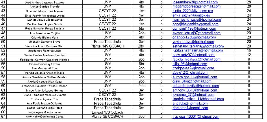A continuación se anexa tabla de resultados de Nivel A y B, los cuales son la preselección de la primera fase, el cual se pre-seleccionaran a 05 estudiantes que representaran al Estado de Chiapas en la XXVIII OLIMPIADA NACIONAL DE QUÍMICA sede Guanajuato.